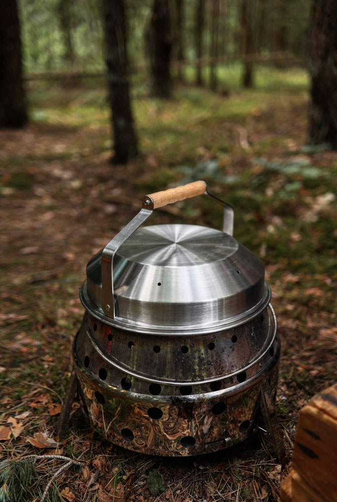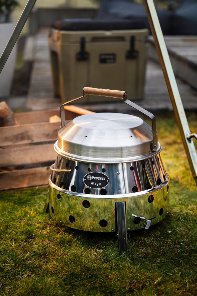 Die Petromax Edelstahl-Grillhaube verwandelt den Atago in einen mobilen Outdoor-Backofen mit Ober- und Unterhitze, der knusprige Gerichte zaubert und dank dem Auffangen warmer Luft, Brennmaterial spart.