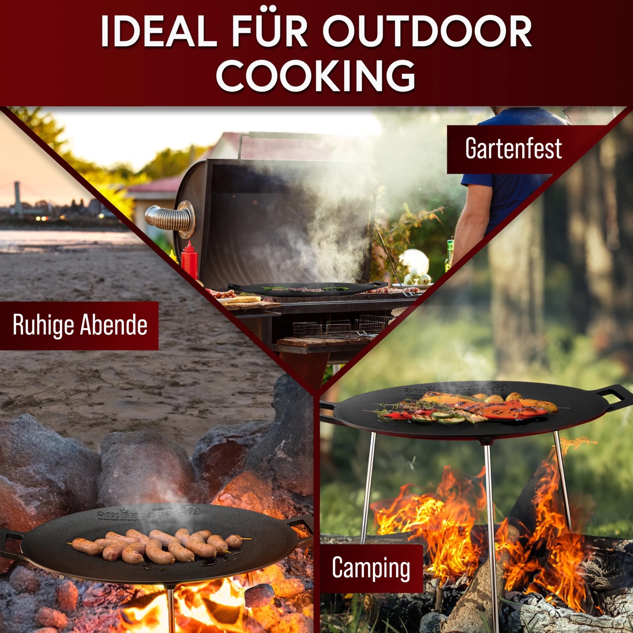 FLEXIBEL EINSETZBARE GRILLPLATTE: Die Gusseisenplatte kann mit oder ohne Edelstahlbeine verwendet werden – ideal für Grill und Lagerfeuer. Perfekte Hitzeverteilung für vielseitiges Koch!