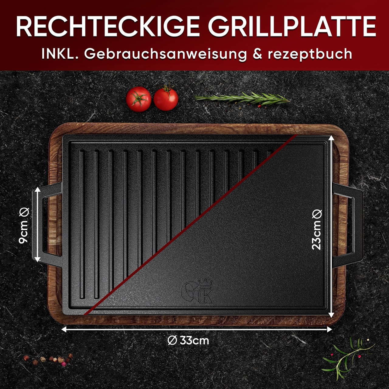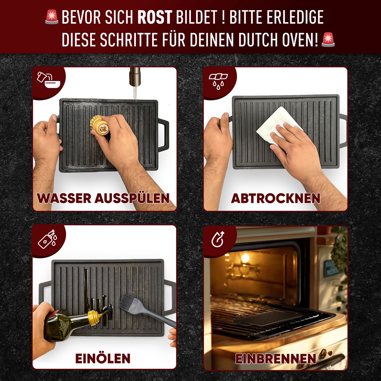 SOFORT EINSATZBEREIT – Die Grillplatte Gusseisen ist bereits eingebrannt und sofort einsatzbereit. Perfekt als Induktion Grillplatte, für Gasgrill, Herd oder Backofen – kein Vorbehandeln nötig, ideal für Indoor- und Outdoor-Kochen.