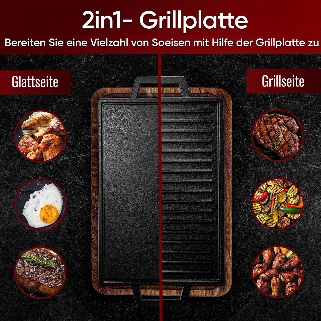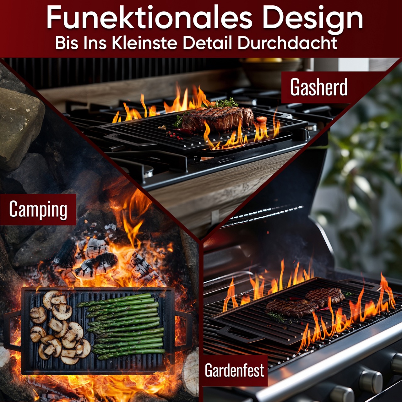 WENDBARE GUSSPLATTE – Beidseitige Gussplatte für Gasgrill: Geriffelt für Grillstreifen, glatt für Pancakes, Teppanyaki oder als Plancha Grillplatte Gusseisen – maximale Flexibilität für jedes Gericht.