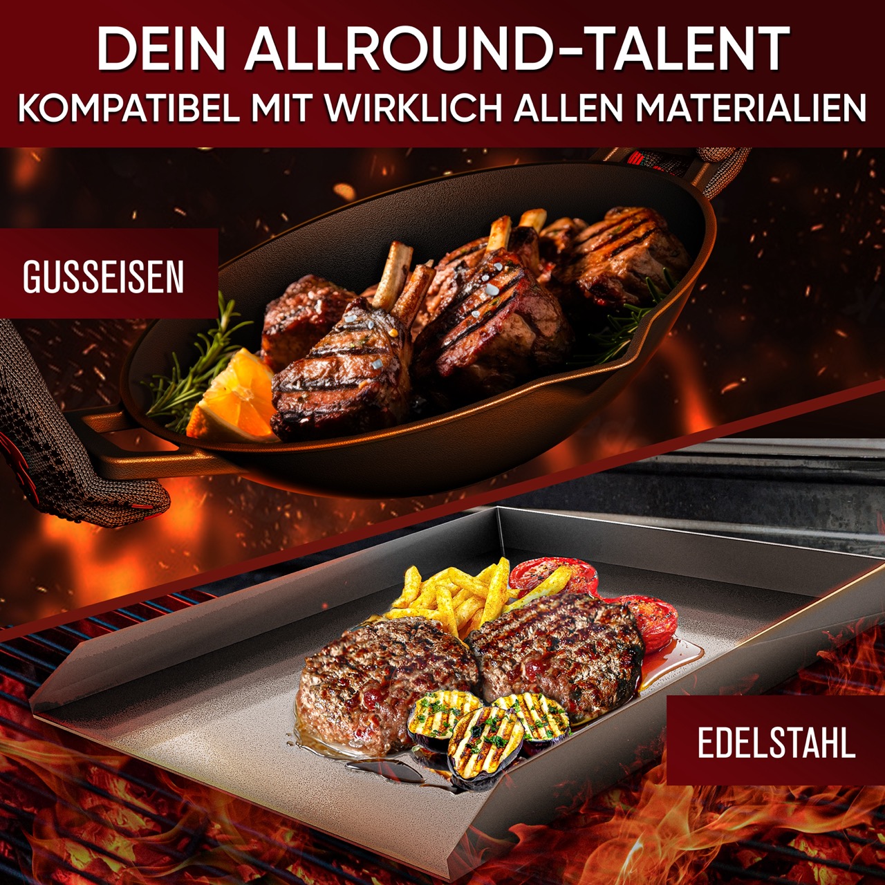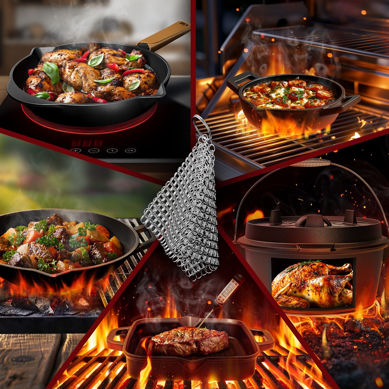 Der Ringreiniger aus Edelstahl beseitigt mühelos hartnäckige Speisereste sowie eingebrannte Verschmutzungen von Gusseisenpfannen, Dutch Ovens und anderem Kochgeschirr, ohne dabei die Oberfläche zu beschädigen! Gefertigt aus rostfreiem Edelstahl, zeichnet sich der Ringreiniger durch seine Langlebigkeit, Stabilität und hygienische Eigenschaften aus. Er eignet sich hervorragend zur regelmäßigen Pflege deiner hochwertigen Kochutensilien! Spüle Gusseisen zunächst mit warmem Wasser (ohne Spülmittel) ab und reinige es anschließend behutsam mit dem Ringreiniger. Im Anschluss gut trocknen lassen und leicht einölen – so bleibt die Patina dauerhaft erhalten. Dank seines flexiblen Designs passt sich der Ringreiniger mühelos den Konturen deines Kochgeschirrs an, was eine schnelle und gründliche Reinigung ermöglicht – selbst an schwer erreichbaren Stellen!