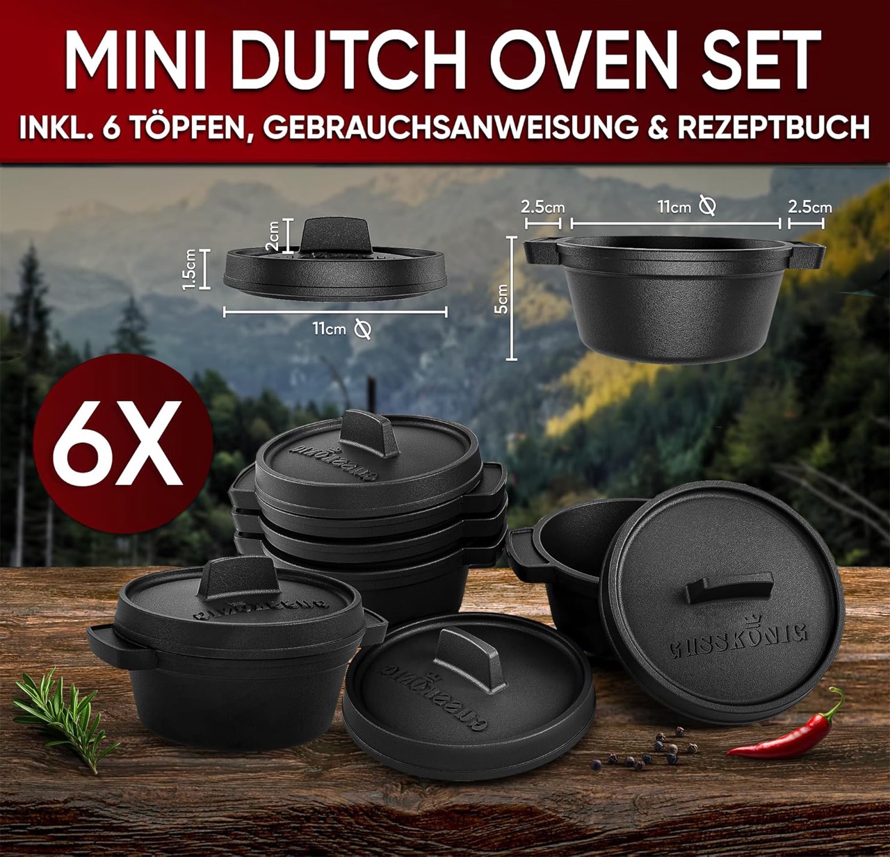 MEHR VOLUMEN & MEHR GENUSS: Unsere Mini Gusseiserne Pfännchen mit seinen 300ml fassenden Töpfen bieten mehr Raum für kreative Küche. Ideal für Vorspeisen, Desserts und mehr – Der Clou: Die Deckel können zugleich als Mini-Pfanne verwendet werden!