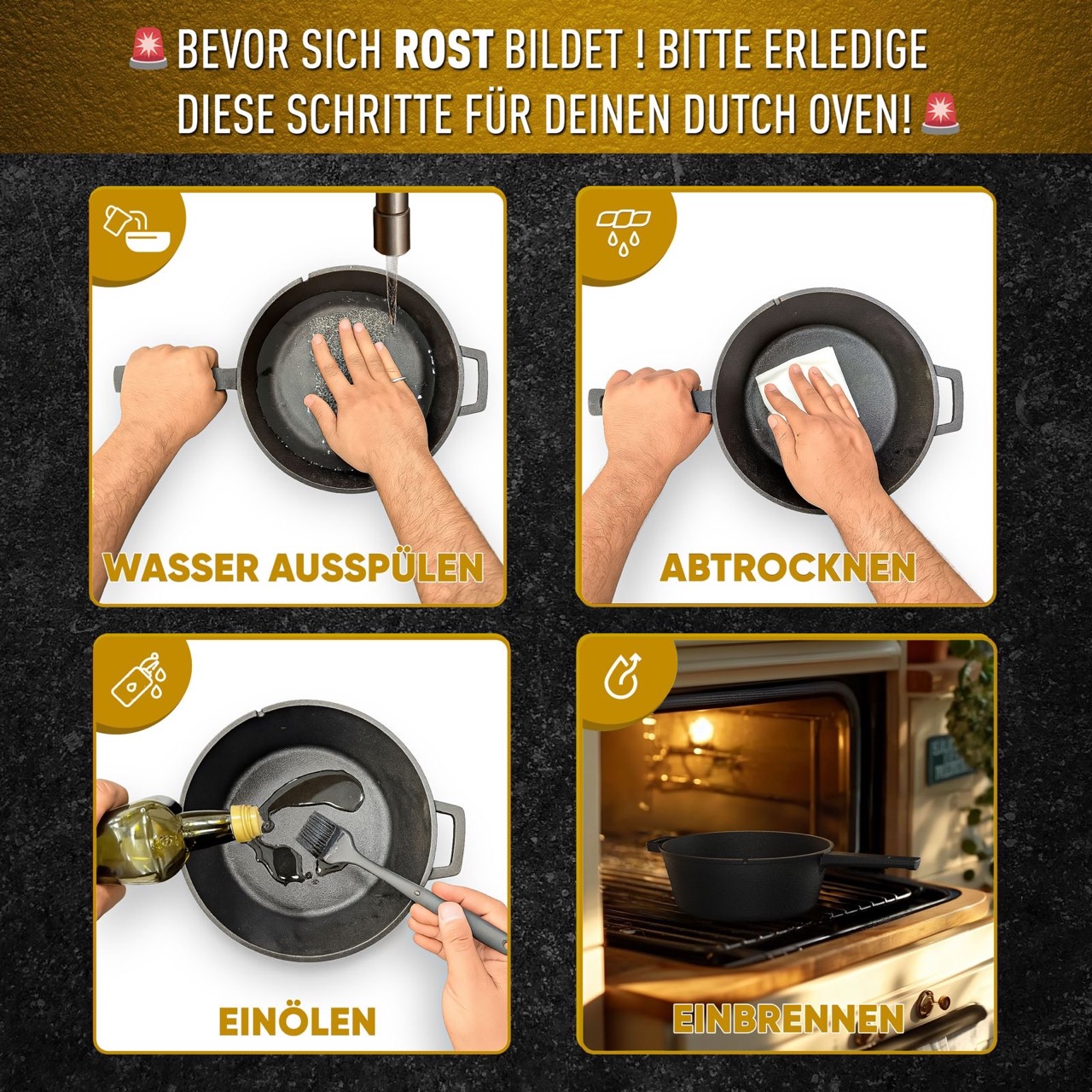 DUTCH OVEN ZUBEHÖR: Unser umfangreiches Gusstopf-Set hat folgendes zu bieten: 2x Echtleder-Griffe zum Anheben des Deckels, einen Ringreiniger aus Edelstahl, einen Edelstahl-Untersetzer und ein Dutch Oven Rezeptbuch mit vielen abwechslungsreichen Rezeptideen – perfekt für Brotbacken oder Back.