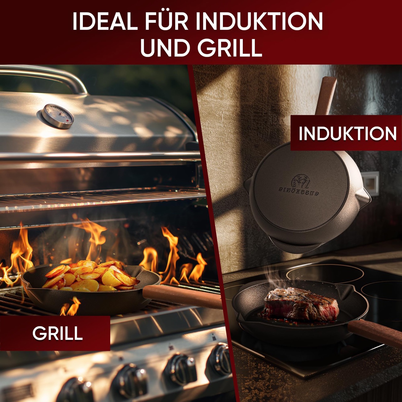 VIELSEITIG EINSETZBAR: Unsere Grillpfannen ist für alle Herdarten inklusive Induktion geeignet. Ob Indoor oder Outdoor, scharfes Anbraten von Steaks oder sanftes Schmoren von Gemüse, unsere Pfanne ist DEIN zuverlässiger Partner in jeder Situation!