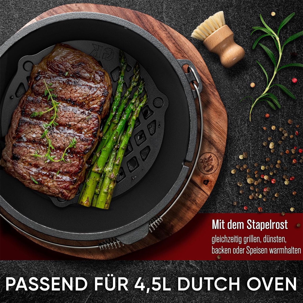 STAPELROST FÜR DUTCH OVEN: Ermöglicht das Stapeln von Komponenten im Dutch Oven, um mehrere Speisen gleichzeitig zu backen, dünsten oder dampfgaren – perfekt für gleichmäßiges Garen ohne Geschmacksübertragung!